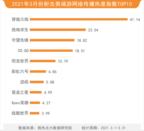 在射击类游戏中,穿越火线以41.14的热度指数依然位居榜首。绝地求生、守望先锋、CS:GO、坦克世界等游戏位列其后。