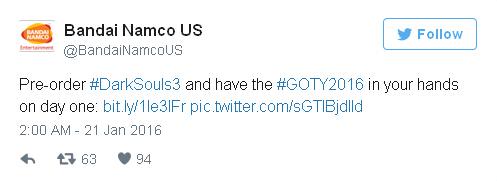 万代南梦宫日前在推特上发表了一条信息表示,“预购《黑暗之魂3》,你将在发售首日就入手这款2016年度最佳游戏”,看来对新作品信心满满啊。