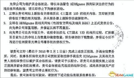 光荣公司律师函还显示,3DM需向光荣公司出具书面文件,说明非法汉化《三国志13》的过程、汇报截至目前为止的非法上传下载数量和镜像数量,报告确切的下载数据等,并要求以上改正措施于2月1日之前完成。